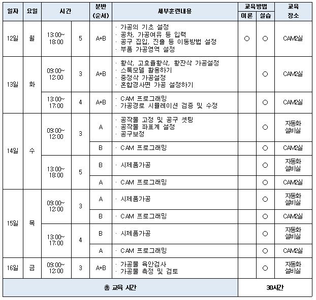| 교육장소 | 한국금형공업협동조합 CAM2실, 실습동 |