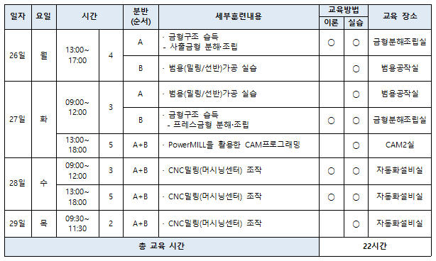 | 교육장소 | 한국금형공업협동조합 CAM2실, 실습동 외 |