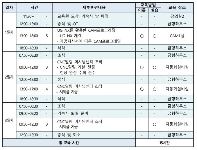 □ 교육과정 개요 1. 교육기간(시간) : 2021. 10. 20(수) ~ 2021. 10. 22(금), 2박3일(15시간) 2. 교육수준 : 초급 3. 교육대상자 : 부천공업고등학교 도제반 재학생 6명 4. 교육목표 - UG NX를 활용하여 CAM프로그램 데이터를 생성할 수 있다. - CNC밀링의 작동원리를 이해하고 현장 안전수칙을 익힐 수 있다. - 장비의 기초 세팅방법 및 작동법을 보고 이해할 수 있다. 5. 교육장소 : 한국금형공업협동조합(금형기술교육원) □ 교육 일정표 |