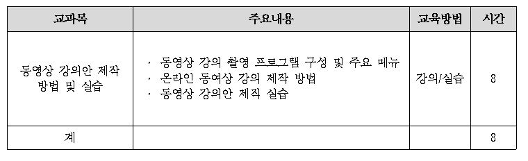 □ 교육과정 개요 · 교육과정명 : 현장맞춤 교수자 실무교육(동영상 강의안 제작 방법 및 실습) · 교육기간(시간) : 2021년 11월 27일(토) 09:00 ~ 18:00 (8H) · 교육대상 : 현장 교수자 및 기술지도자 등 · 교육장소 : 한국금형기술교육원 2층 설계교육 2실 · 교육내용 · 기타사항 : 무료교육(중식비, 교재제공, 단 숙박비는 자부담임) |